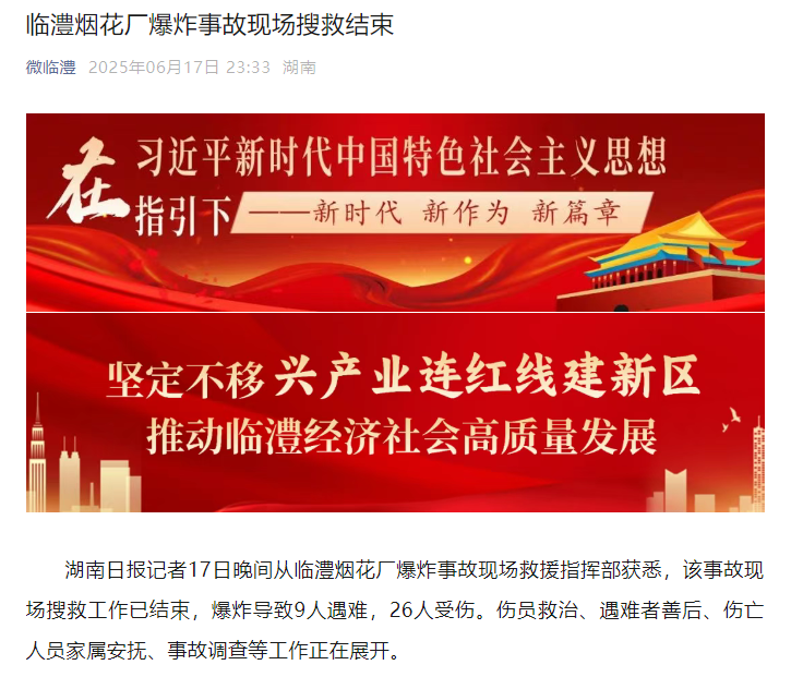 湖南日报记者17日晚间从临澧烟花厂爆炸事故现场救援指挥部获悉,该事故现场搜救工作已结束,爆炸导致9人遇难,26人受伤。伤员救治、遇难者善后、伤亡人员家属安抚、事故调查等工作正在展开。